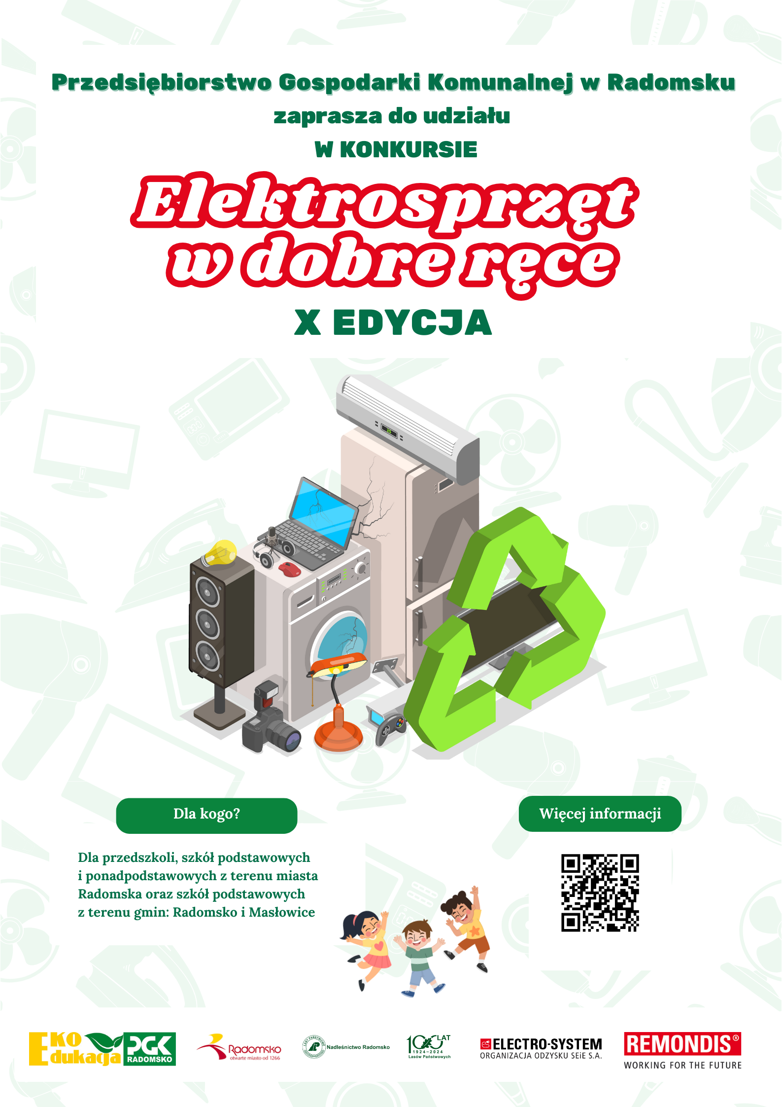 Celem niniejszego konkursu jest zebranie jak największej ilości elektroodpadów, czyli wszystkich zużytych, uszkodzonych lub niepotrzebnych urządzeń elektrycznych i elektronicznych pochodzących z gospodarstw domowych. Elektroodpady można zbierać do dnia 15 września 2025 r. Partnerami konkursu są: Electro–System Organizacja Odzysku Sprzętu Elektrycznego i Elektronicznego S.A. oraz Nadleśnictwo Radomsko.