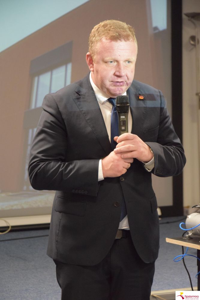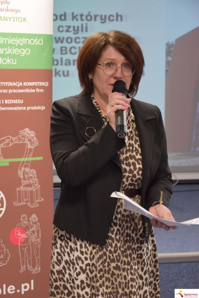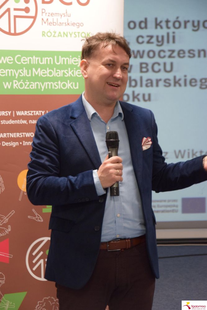Dr inż. Tomasz Wiktorski, prezes Branżowego Centrum Umiejętności Stolarstwa Meblowego w Różanymstoku przedstawił prezentacje związaną z automatyzacją procesów produkcyjnych w przemyśle meblarskim oraz zaprezentował działanie jednego z robotów wykorzystywanych w fabrykach, w wersji szkoleniowej.