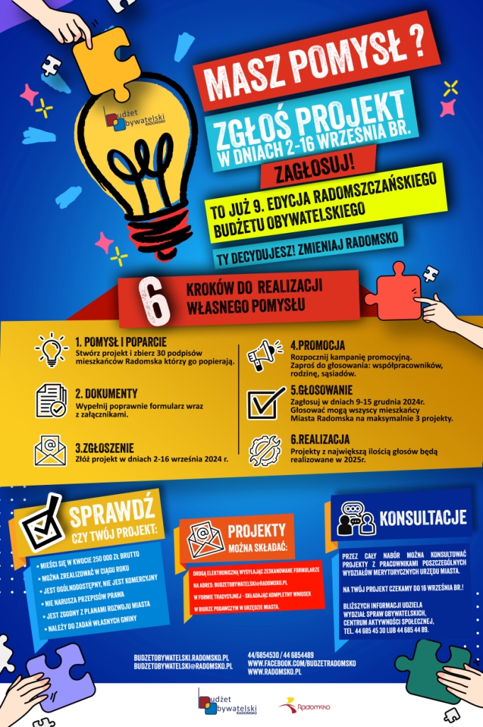 Wydarzenia, działania, małe i duże inwestycje dla mieszkańców całego miasta. Od 2 września każdy z nas może zgłosić swój pomysł na projekt do Radomszczańskiego Budżetu Obywatelskiego. Zapraszamy.