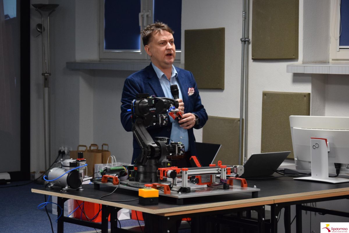 Dr inż. Tomasz Wiktorski, prezes Branżowego Centrum Umiejętności Stolarstwa Meblowego w Różanymstoku przedstawił prezentacje związaną z automatyzacją procesów produkcyjnych w przemyśle meblarskim oraz zaprezentował działanie jednego z robotów wykorzystywanych w fabrykach, w wersji szkoleniowej.