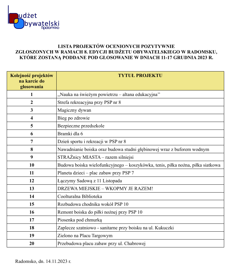 Rozlosowane numery projektów BO